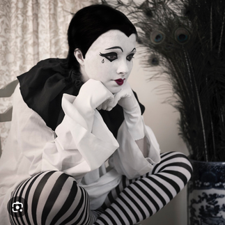 Descrição da imagem: um palhacinho Pierrot sentado, com a cabeça apoiada nas mãos. Seu rosto está pintado de branco e ele possui uma lágrima pintada abaixo do olho. Pierrot é um palhaço triste conhecido por ser ingênuo e por sempre voltar a confiar, apesar de tudo.